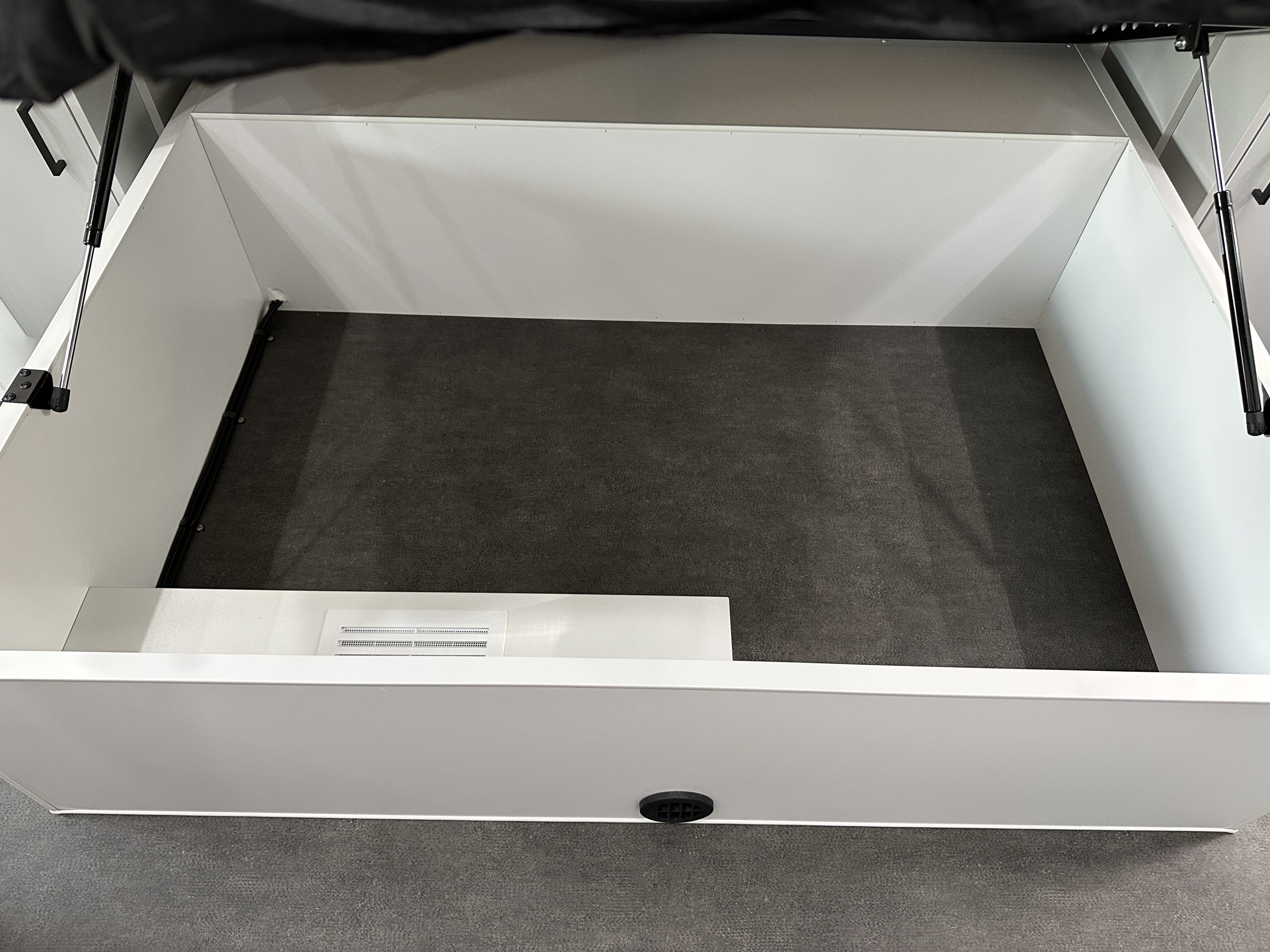 - East West Lift Up Bed with Storage Beneath, Overhead Cupboards with LED Strip Light, Magazine Pouch & Mattress with Bolster