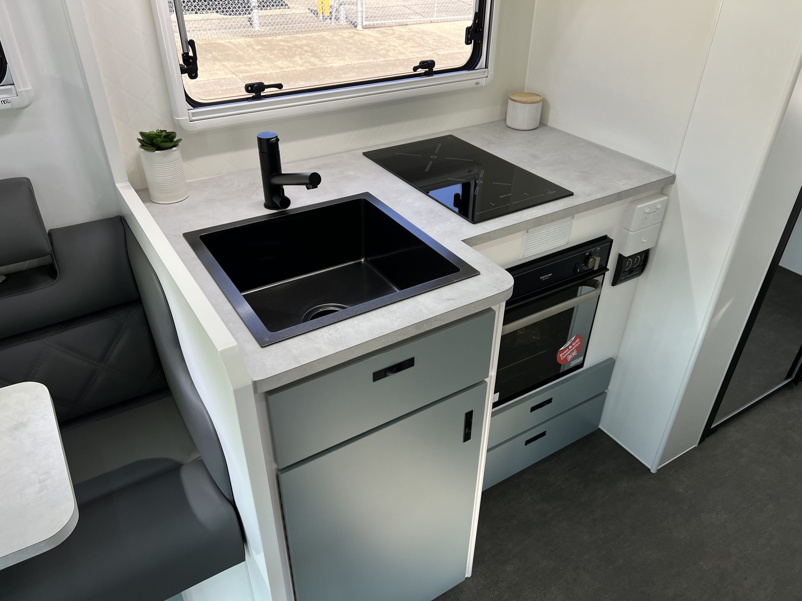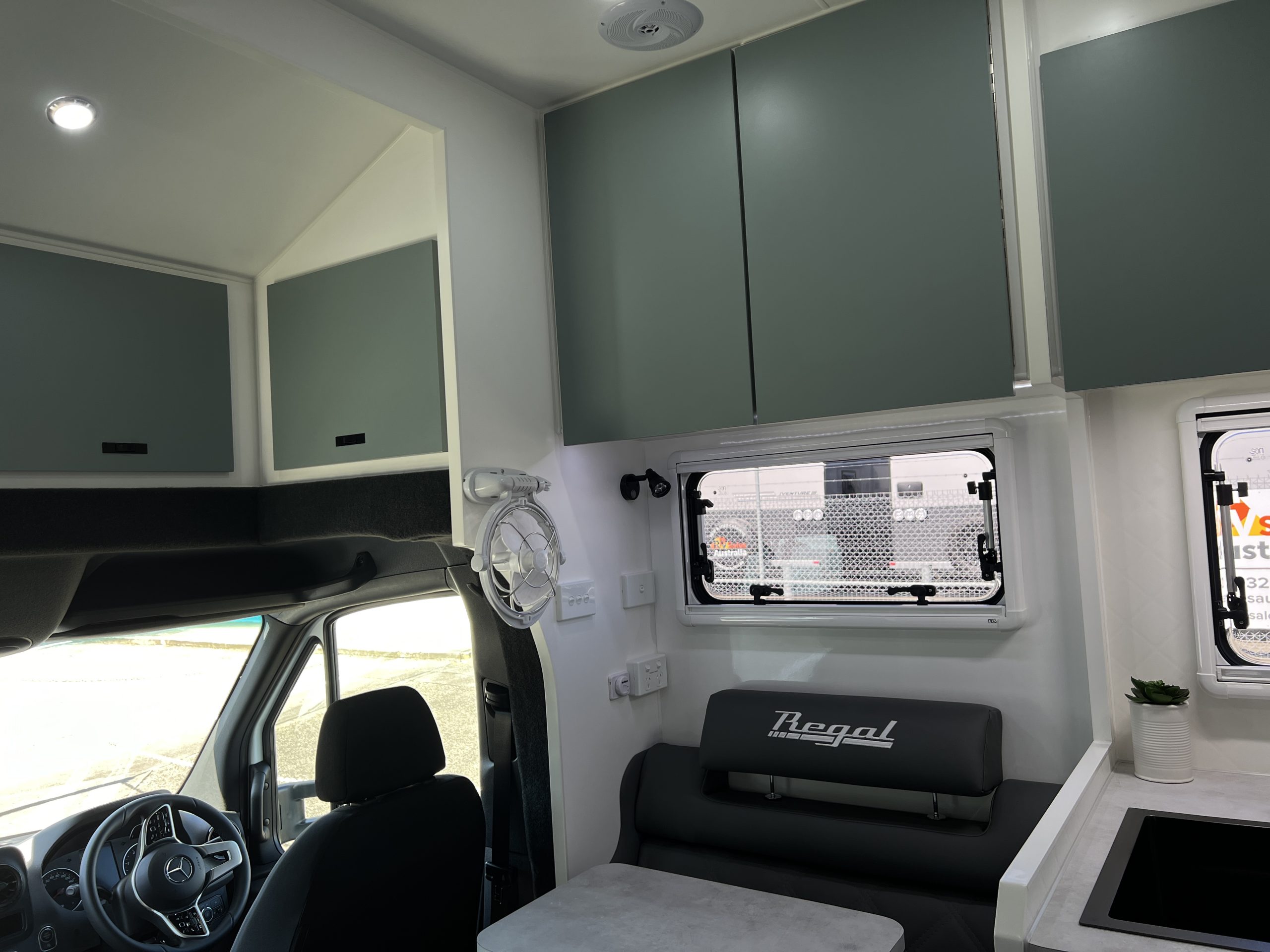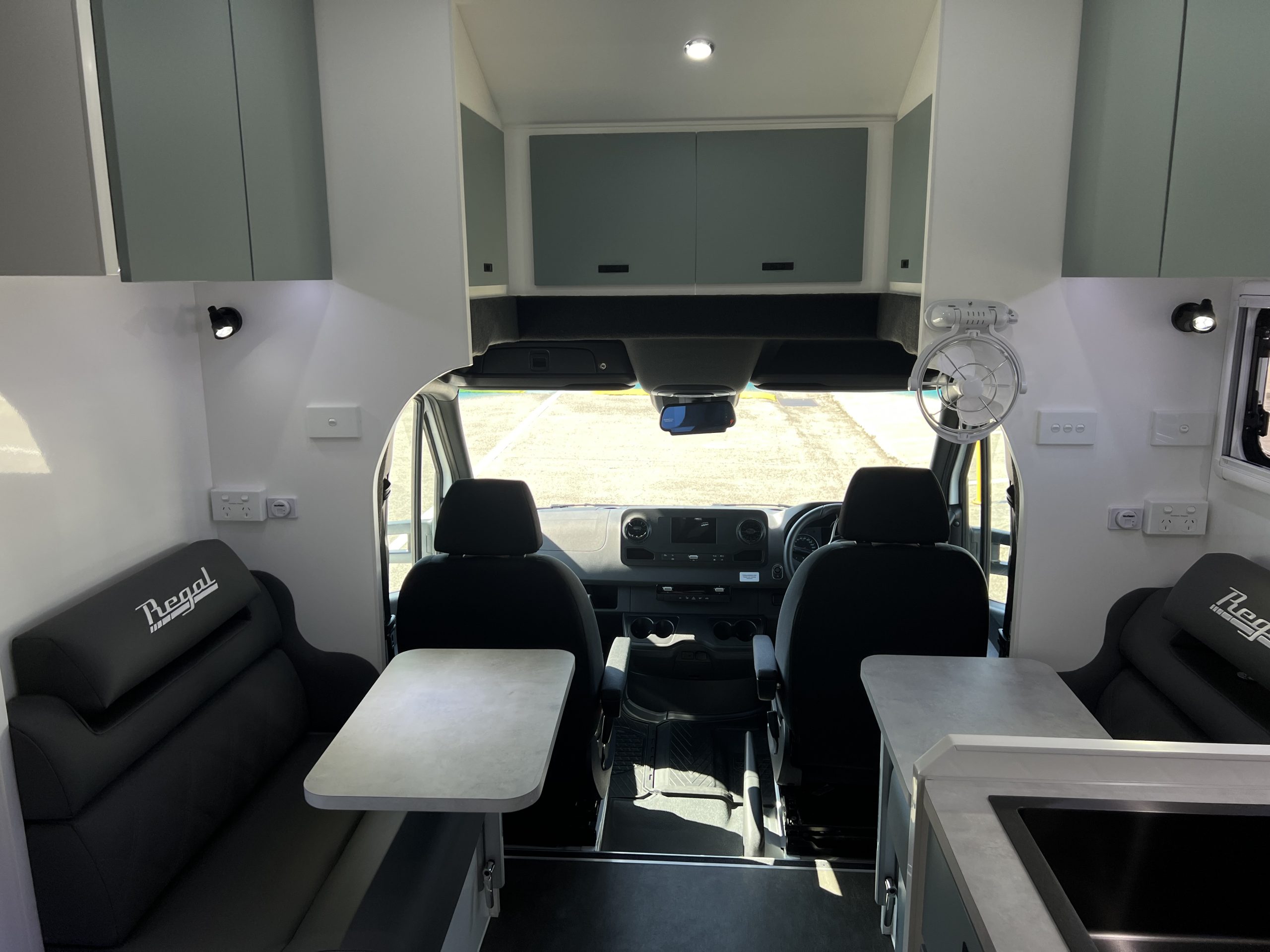 - Seating Area with Adjustable Headrests, Table, Map Reading Lights, Double Powerpoints, USB/USBC Ports, Window, Adjustable Fan, Overhead Cupboards with LED Strip Lights