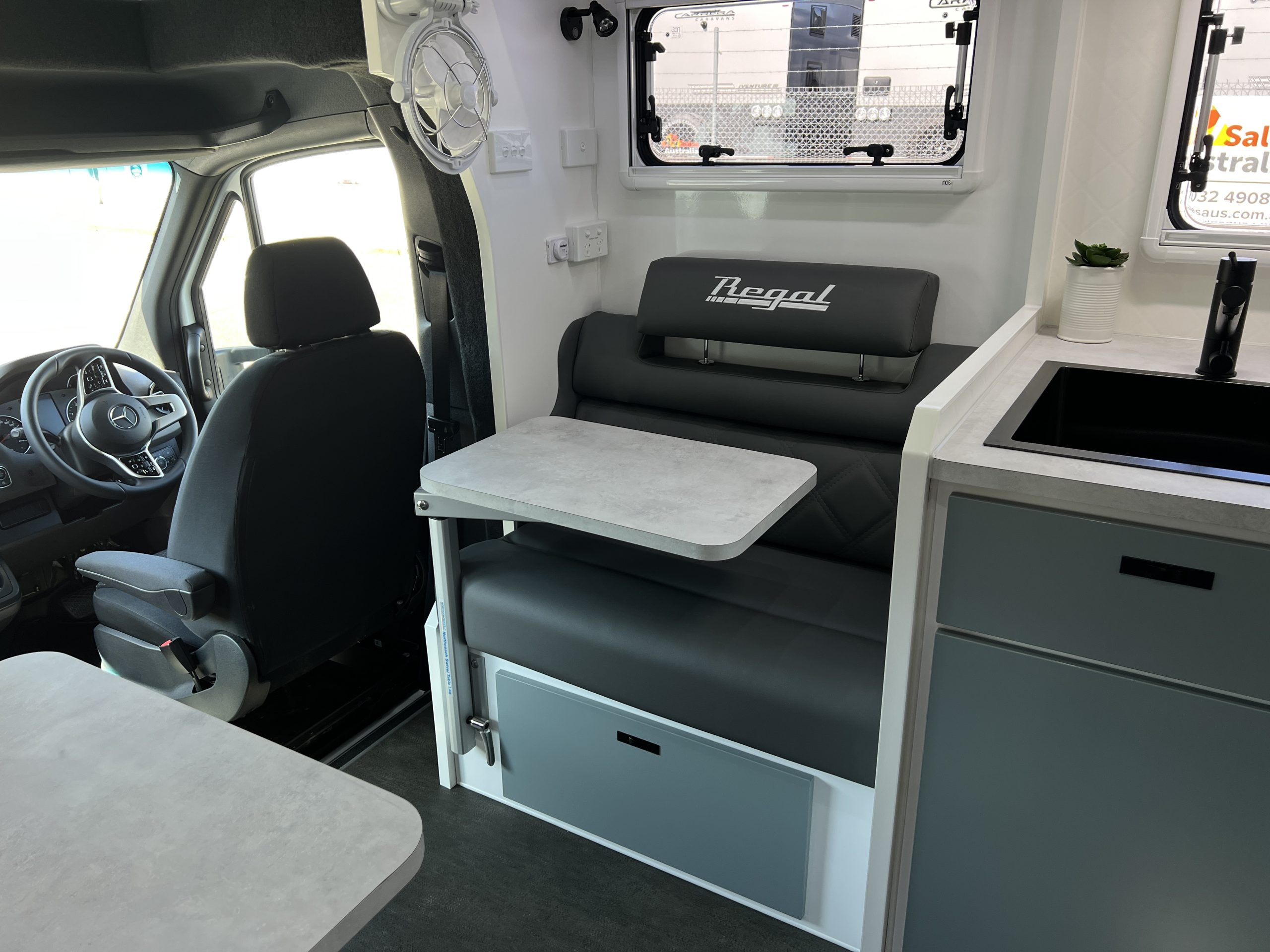 - Seating Area with Adjustable Headrests, Table, Map Reading Lights, Double Powerpoints, USB/USBC Ports, Window, Adjustable Fan, Overhead Cupboards with LED Strip Lights